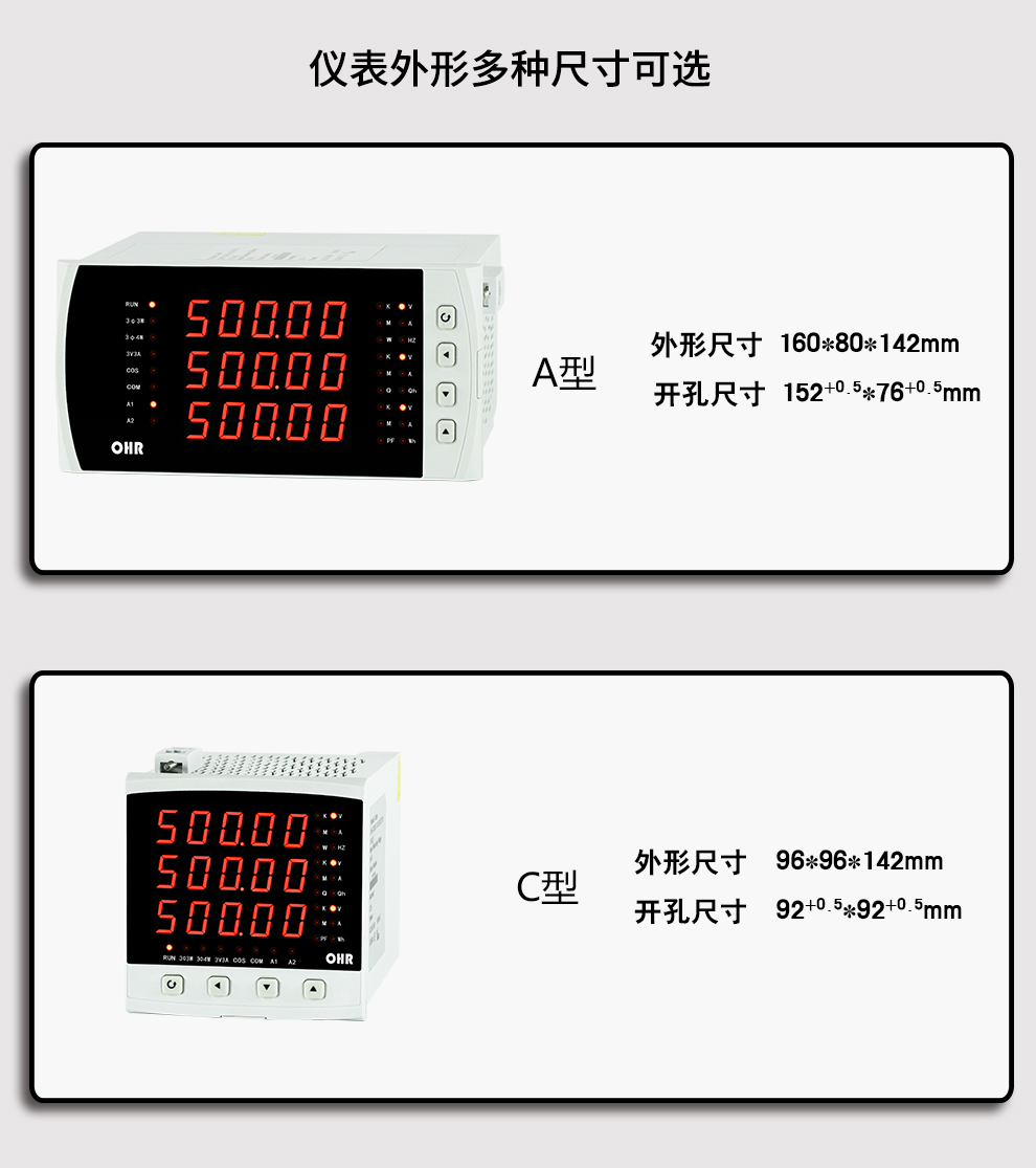 OHR-C300系列三相綜合電量表采用大規(guī)模集成電路和高亮度長壽命的LED顯示器,應(yīng)用數(shù)字采樣技術(shù),對三相電氣線路中的相電壓、線電壓、相電流、線電流、有功功率、無功功率、視在功率、頻率、功率因數(shù)、等進行實時測量顯示與控制。