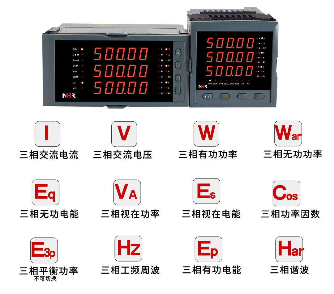 NHR-3300系列三相綜合電量表采用大規(guī)模集成電路和高亮度長壽命的LED顯示器,應用數字采樣技術,對三相電氣線路中的相電壓、線電壓、相電流、線電流、有功功率、無功功率、視在功率、頻率、功率因數、等進行實時測量顯示與控制。